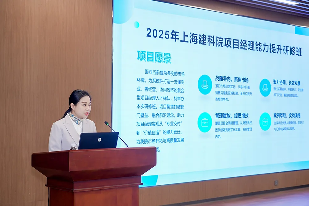 黨委辦公室副主任、人力資源部總經(jīng)理徐曼作項(xiàng)目總體介紹。本次研修班為期一個(gè)月,以“系統(tǒng)化提升項(xiàng)目管理能力、完善人才梯隊(duì)建設(shè)、助力企業(yè)高質(zhì)量發(fā)展”為核心目標(biāo),圍繞“戰(zhàn)略引領(lǐng)、市場(chǎng)攻堅(jiān)、能力內(nèi)化、效能躍升”四個(gè)維度,為建科院核心項(xiàng)目人才搭建了學(xué)習(xí)交流、賦能成長(zhǎng)、協(xié)作共贏的平臺(tái)。
